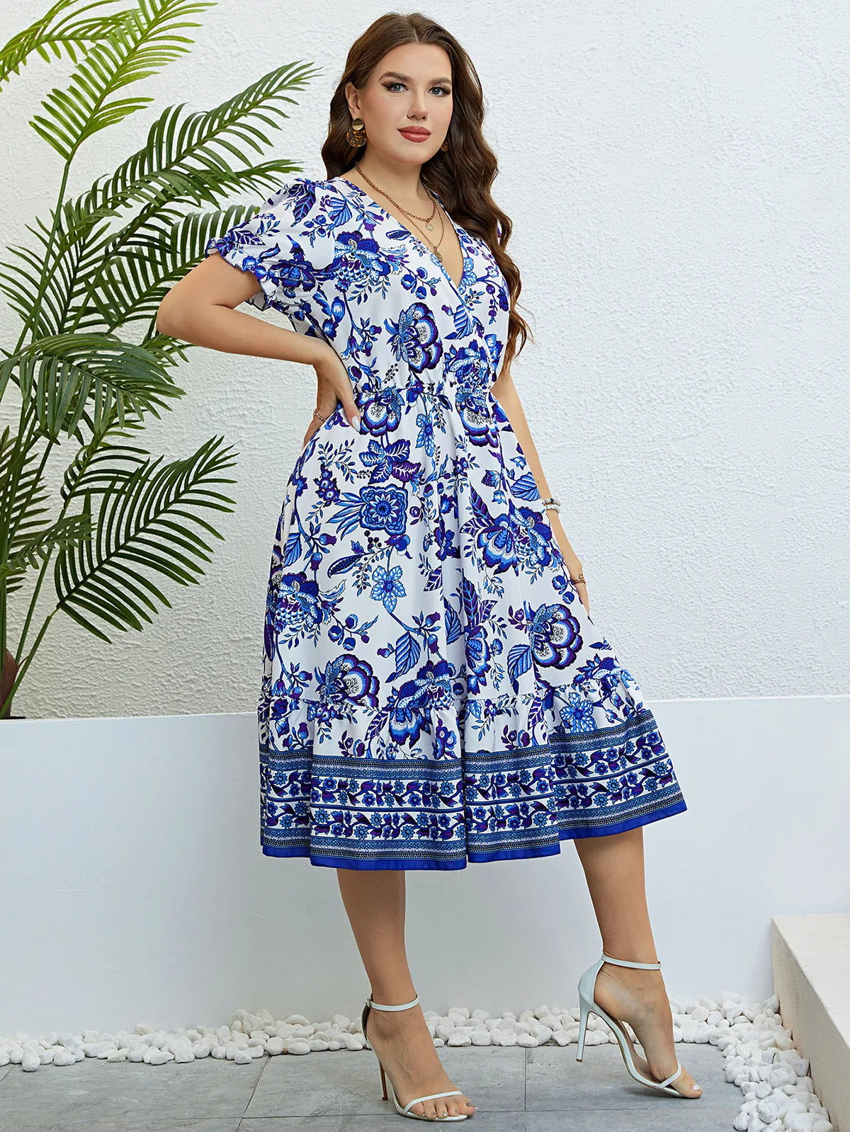 Plus-Size A-Line Party Dress with Floral Print & V-Neck