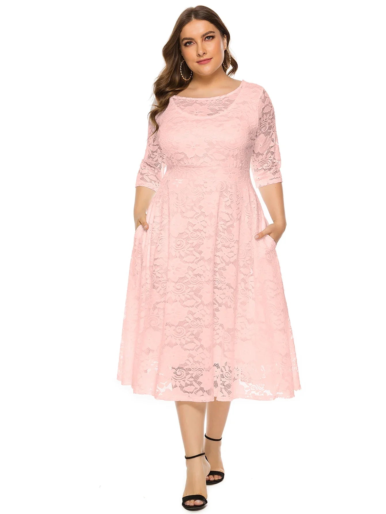 Step into the spotlight with this plus-size midi dress featuring contrasting lace, a stunning ensemble that strikes the perfect balance between sophistication and allure. The half sleeves with delicate lace detailing add a touch of elegance and femininity, creating a chic and contemporary look. The semi-sheer design exudes subtle sensuality while maintaining a tasteful silhouette