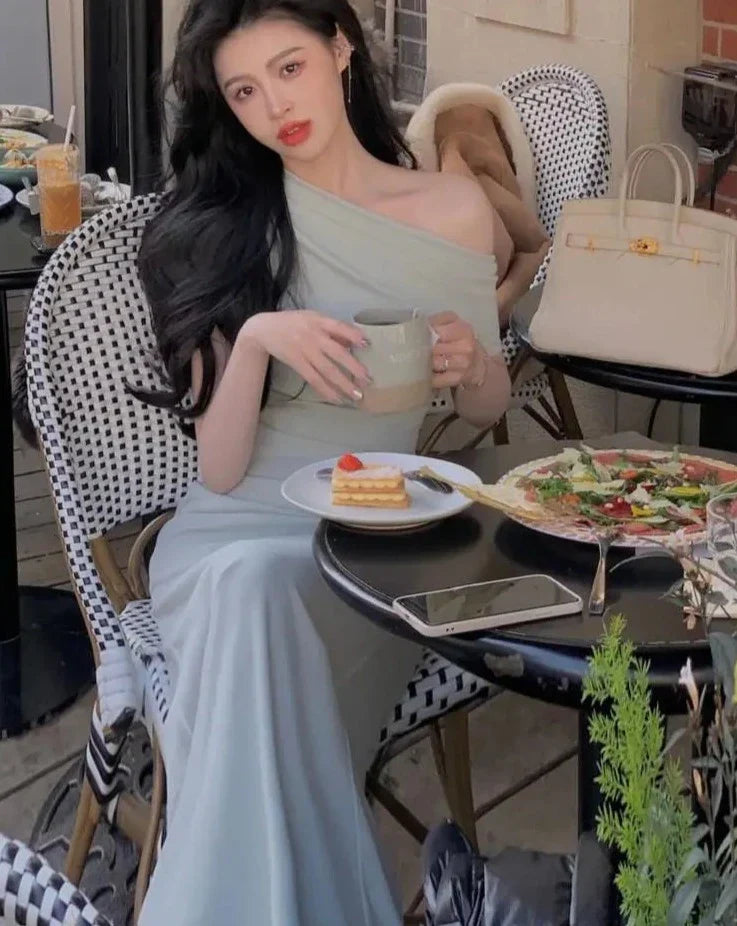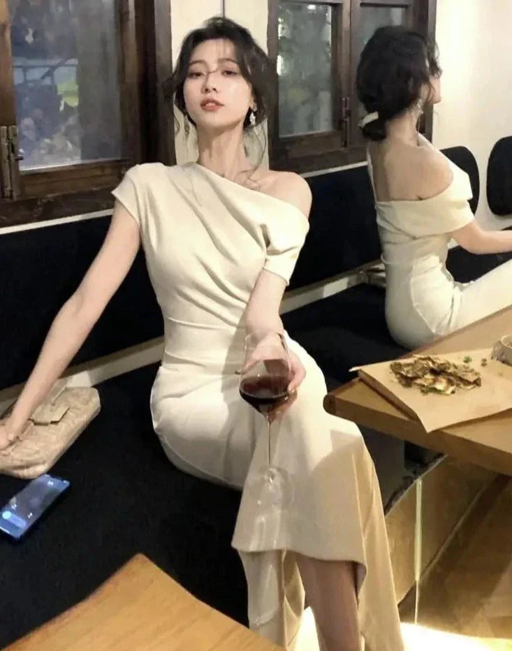 - Design: Off-shoulder, figure-hugging, long maxi dress