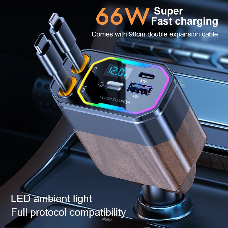 120W 4-in-1 Retractable Car Charger with USB-C & Cigarette Lighter Adapter – Vega
