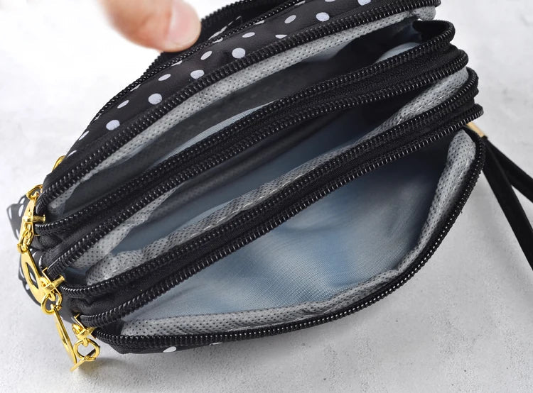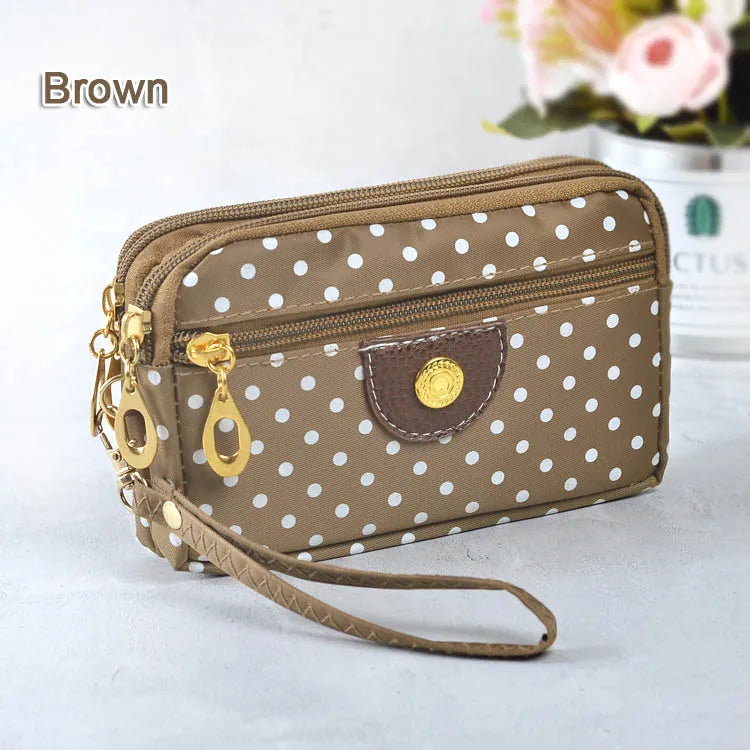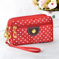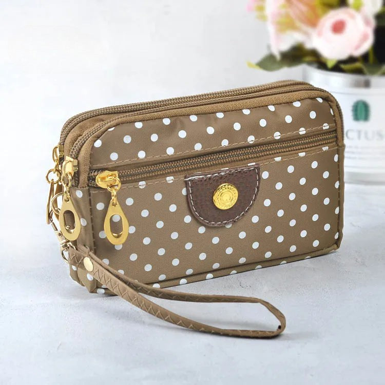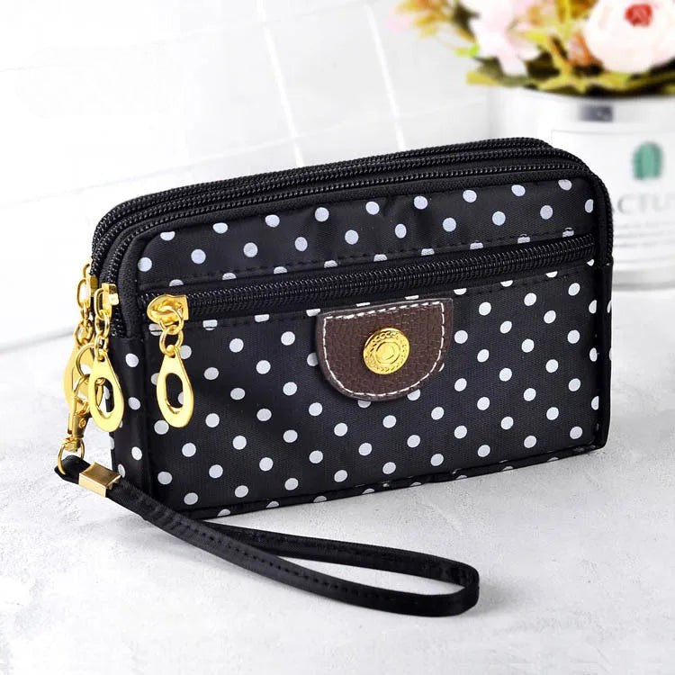 Discover the perfect blend of style and convenience with our trendy women's wallets. These small purses, adorned with charming canvas polka dots, exude feminine elegance while featuring a secure zip closure. Ideal for fashion-forward women on the go, this wallet functions as a multi-purpose clutch, coin purse, cardholder, and wristlet – all in one stylish accessory.