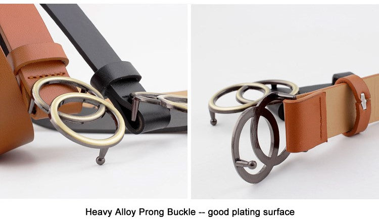 Crafted from premium PU leather, it features a chic metal buckle pin. This versatile accessory is perfect for adding a polished touch to your outfits, whether you're dressing up for a special occasion or elevating your everyday wardrobe. The double-ring design brings a unique, modern flair to your ensemble, while the adjustable prong buckle ensures a comfortable and secure fit.