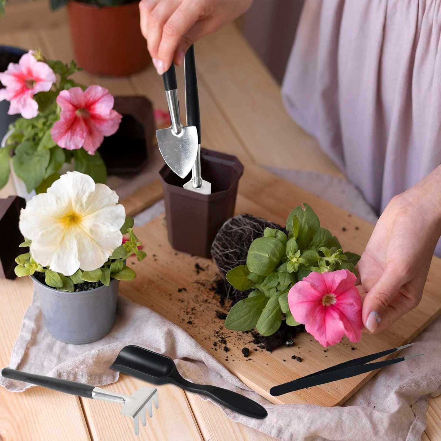 This 12-piece succulent care kit includes scissors, shovels, rake, hole puncher, spoon, tweezers, and a linen storage bag. Designed for repotting, pruning, and weeding, it’s lightweight and compact at just 165 g. Stainless steel tool heads and reusable storage bag keep everything organised, perfect for indoor plant care or gifting.