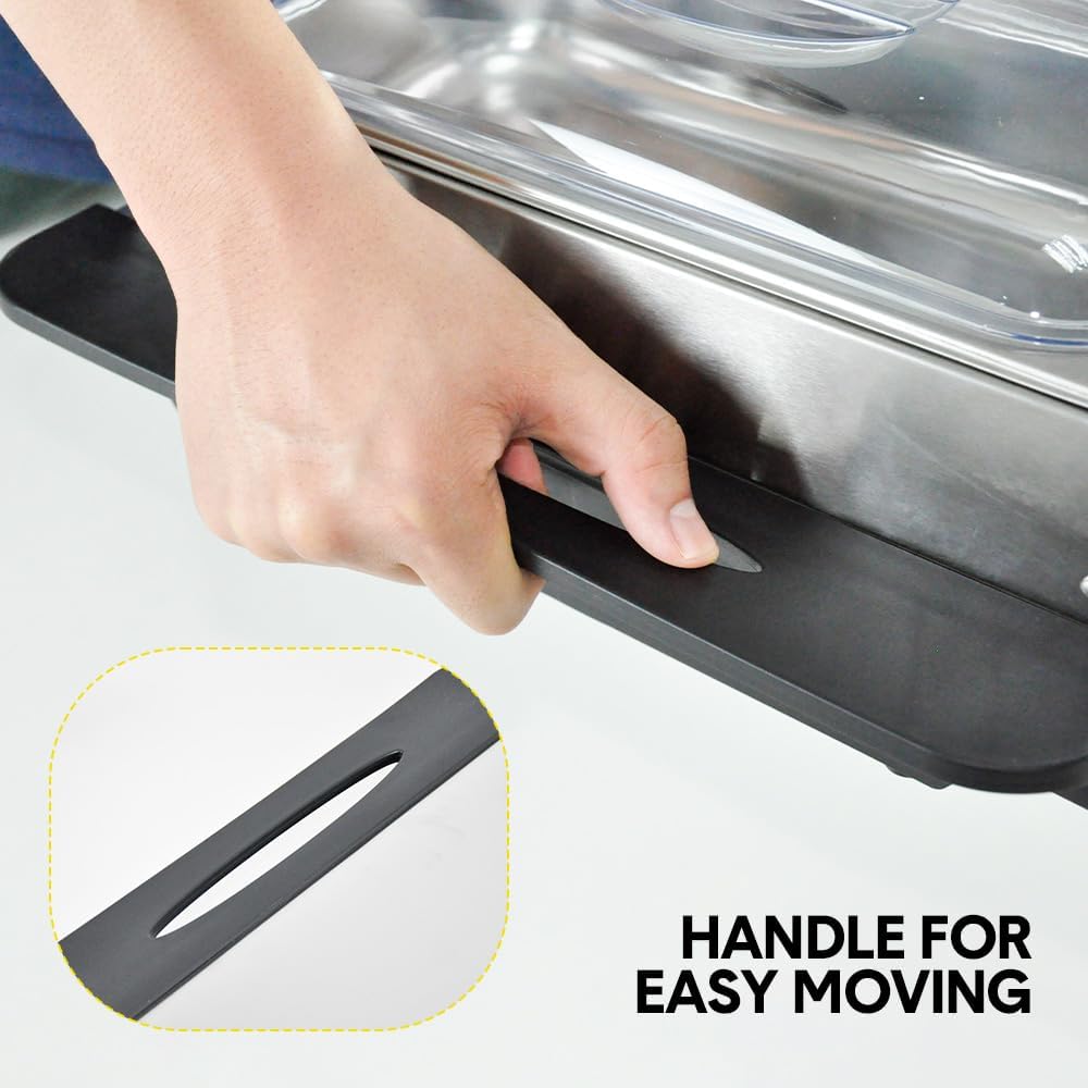 This stainless-steel buffet food warmer is designed to keep multiple dishes warm, fresh, and ready to serve. Featuring three 2.5L trays with lids, it provides plenty of space for mains, sides, and appetisers. The adjustable temperature control (45–70°C) and 300W heating power ensure consistent warming without overcooking. Built with food-grade stainless steel, it’s rust-resistant, easy to clean, and suitable for professional catering or home entertaining.