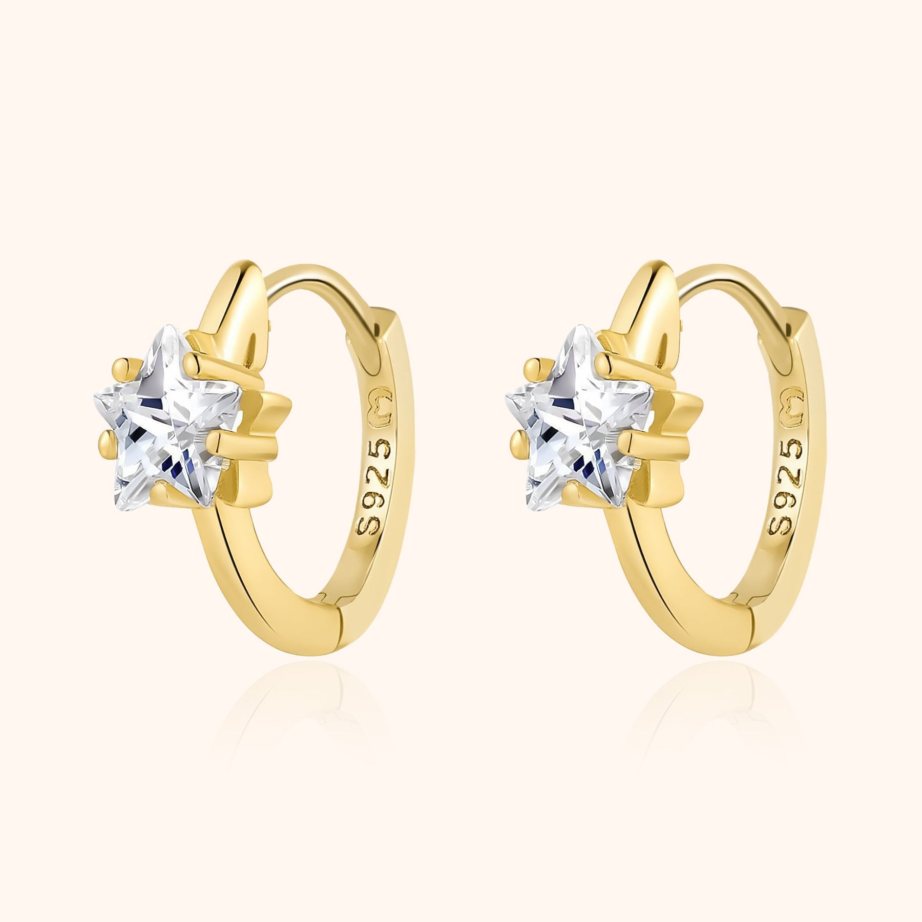 Our Lunara Earrings combine wide hoops with dazzling star-shaped zirconia, making them a striking and stylish accessory. Perfect for adding a sparkling touch to your everyday or festive outfits.