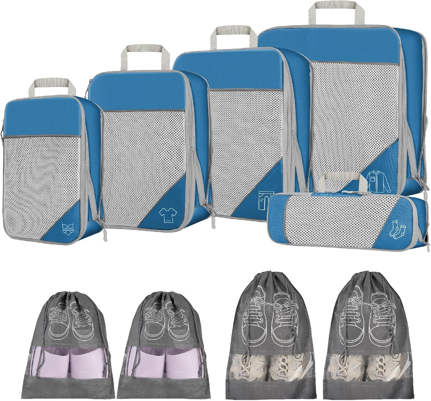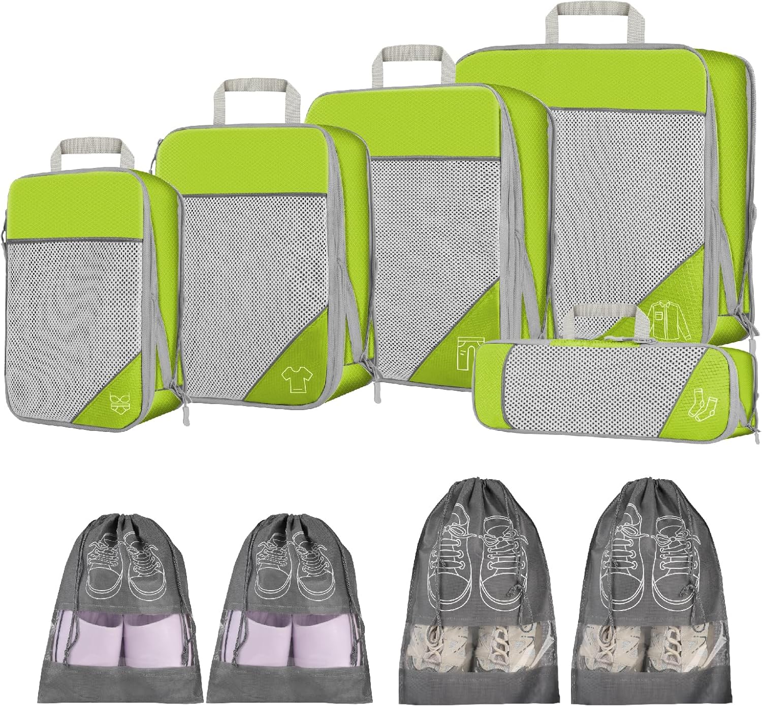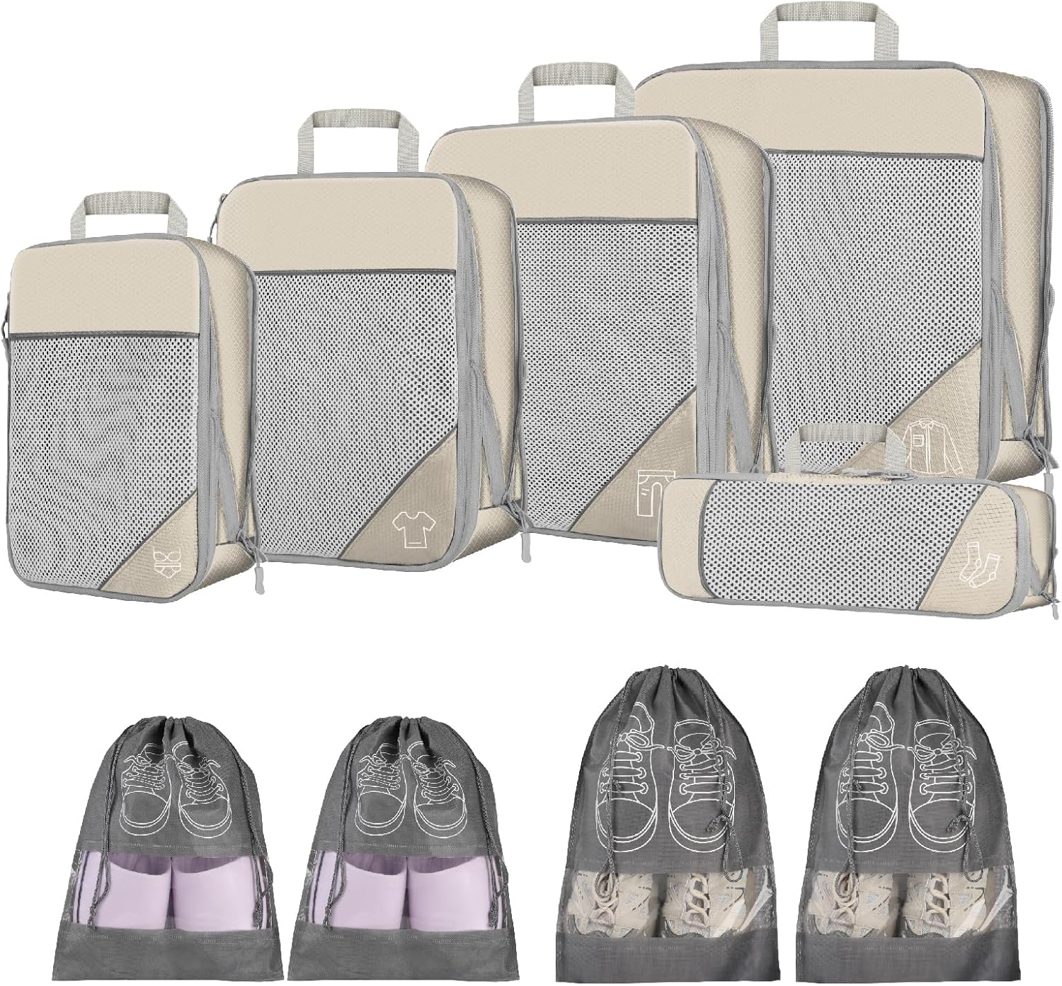 This 9-piece set comes with 5 expandable cubes and 4 shoe bags to simplify packing. The compression design saves up to 60% of luggage space while keeping clothes neat. Made from durable, water-resistant fabric with mesh panels, it helps keep items fresh and easy to find. Ideal for family trips, business travel, or camping.