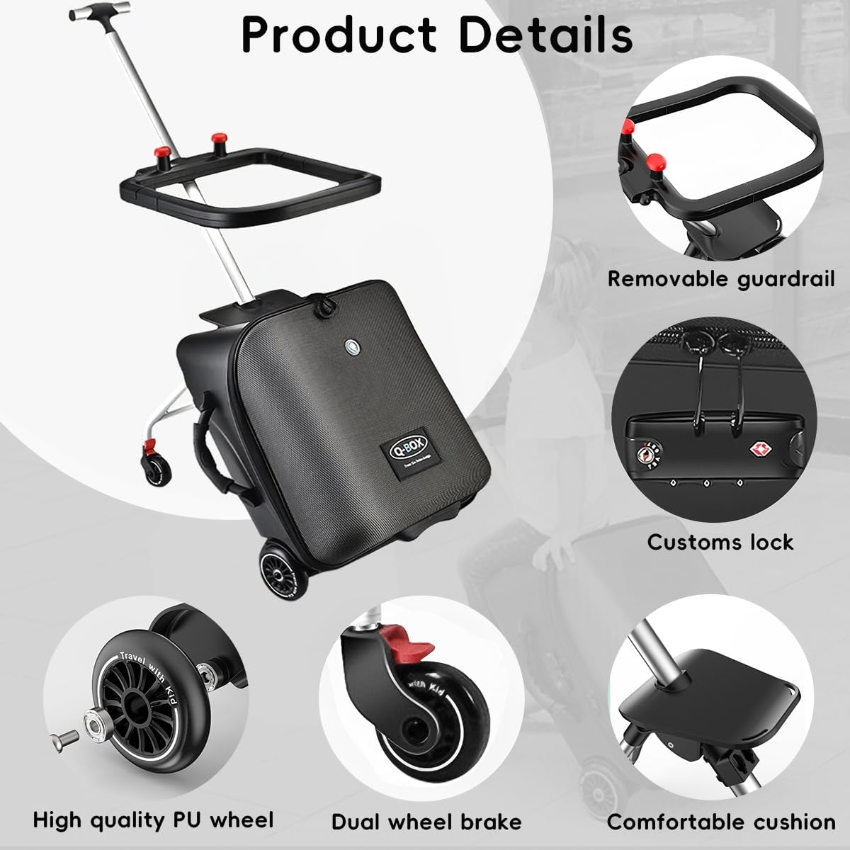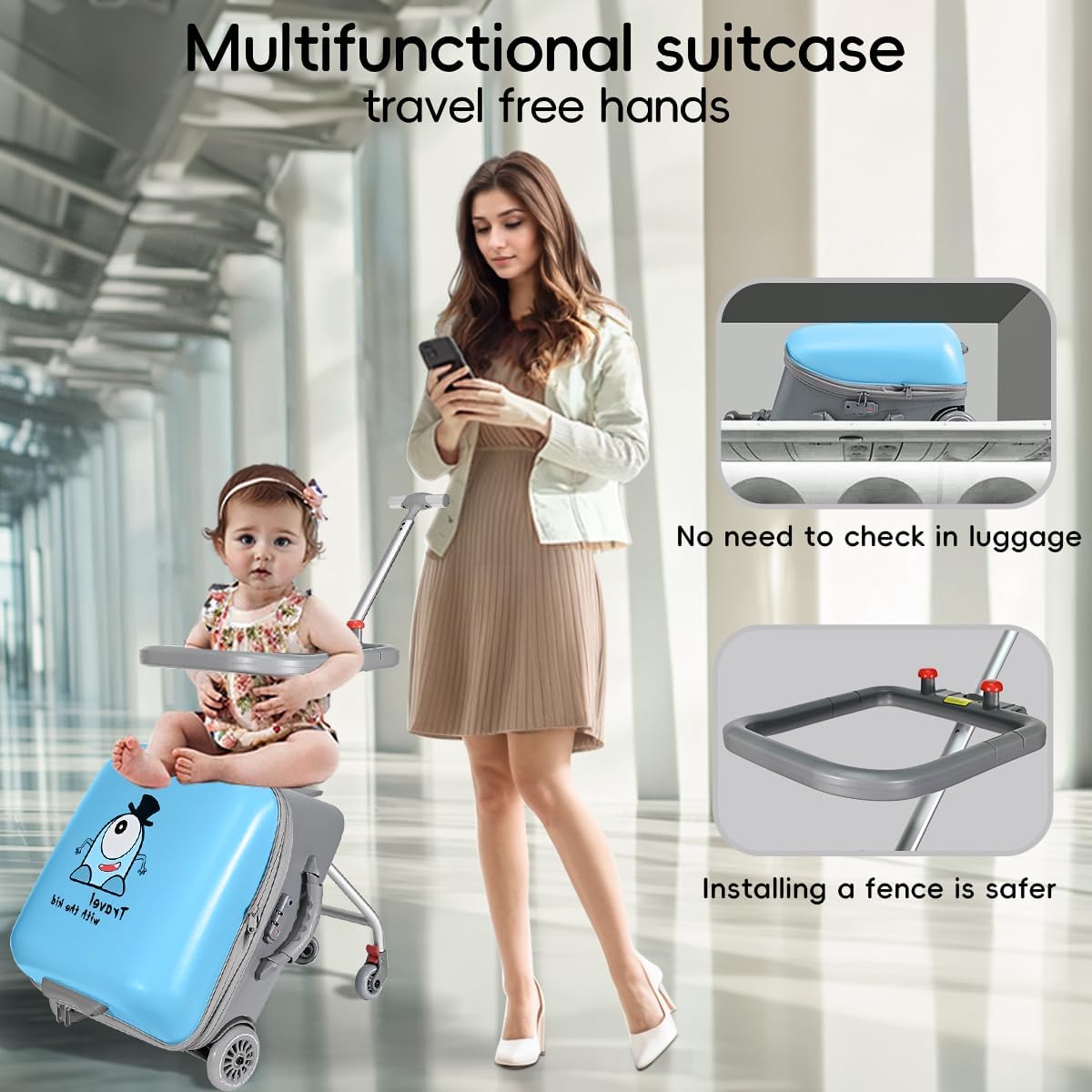 Designed with both storage and comfort in mind, this ride-on suitcase is perfect for holidays, weekend trips, or family outings. It features a foldable child seat with guardrails, a lightweight yet durable build, and smooth spinner wheels for easy handling. With its expandable 20-inch capacity, it holds clothing, toys, and essentials neatly in place, making every journey more enjoyable.