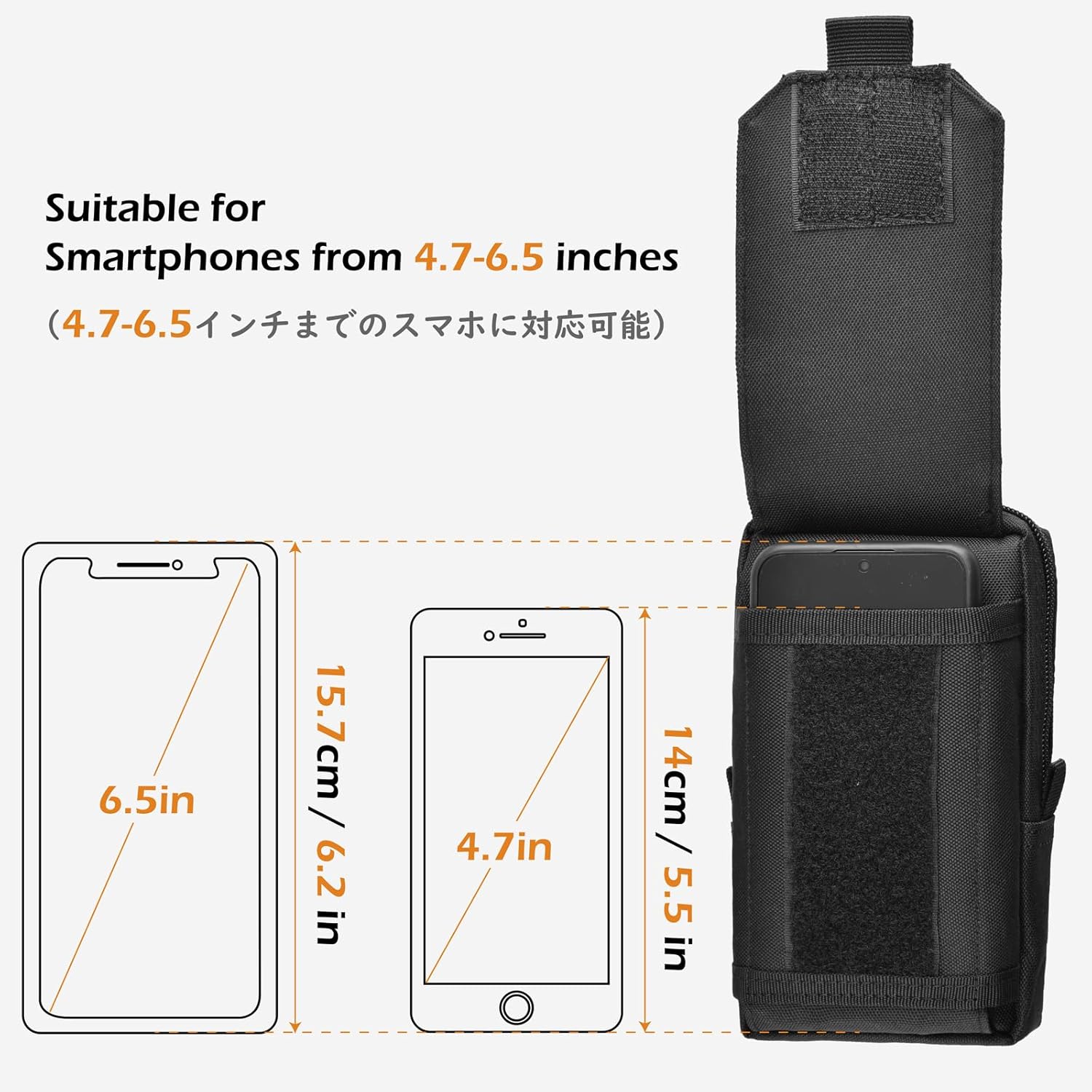 - Front phone pocket with secure hook-and-loop closure.