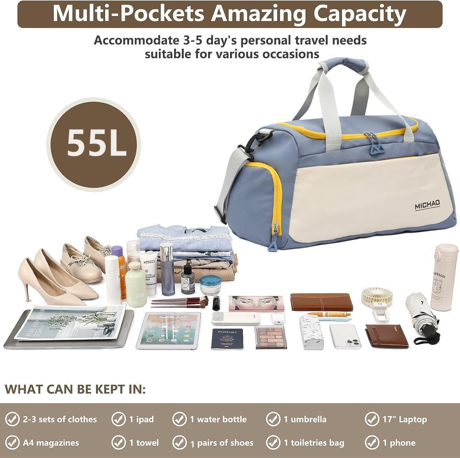 - Compartments: Main storage, separate shoe compartment, waterproof wet pocket, multiple inner and outer pockets