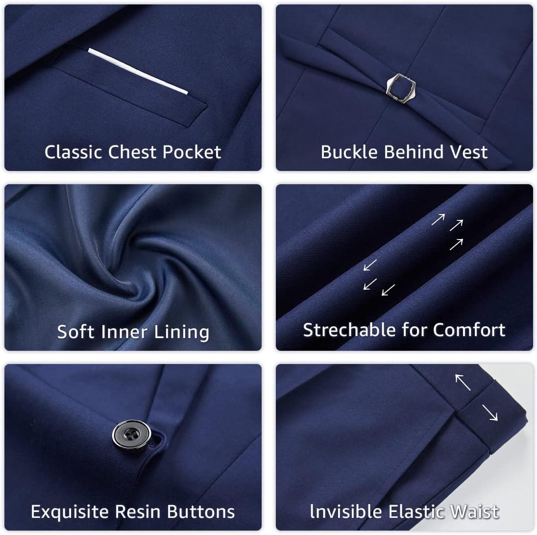 - Closure: Double-button blazer with a zip closure on the trousers.