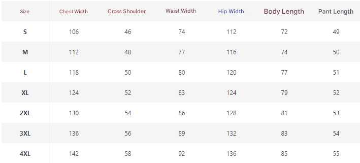 | Size | Chest Width | Shoulder Width | Waist Width | Hip Width | Body Length | Pant Length |