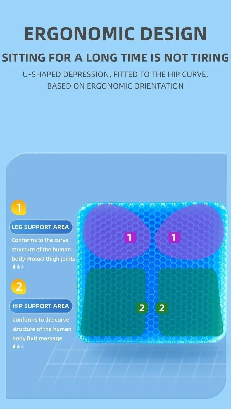 This extra-thick gel seat cushion delivers lasting comfort during long sitting sessions. The oversized honeycomb design distributes weight evenly to reduce pressure on hips and tailbone. Its breathable structure keeps airflow moving, preventing heat build-up even after hours of use. A washable, non-slip cover makes it simple to clean and keeps it securely in place. Ideal for the office, car, wheelchair, or home use.