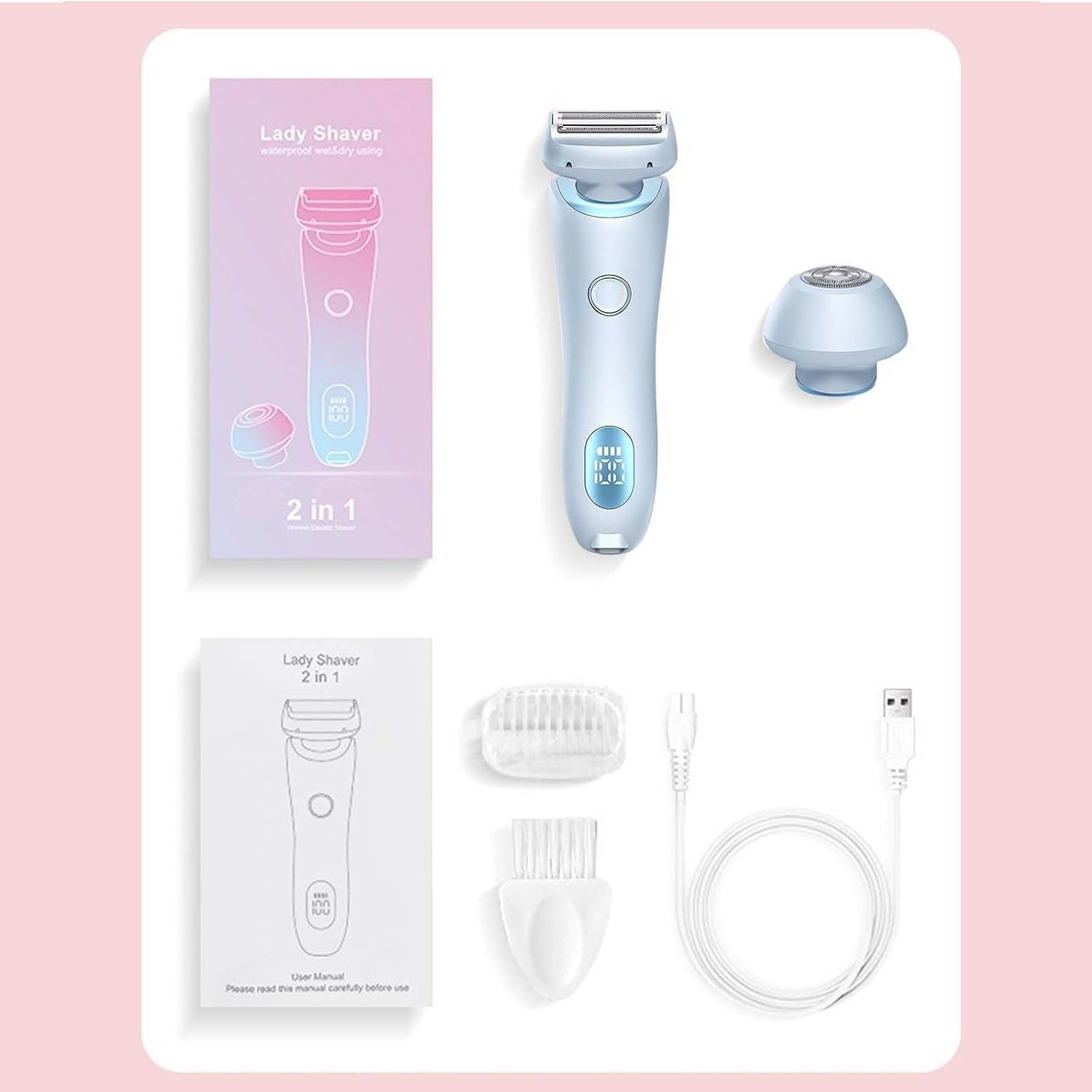 - Package includes: 1 × electric shaver, 2 × detachable heads, 1 × USB cable, 1 × user manual