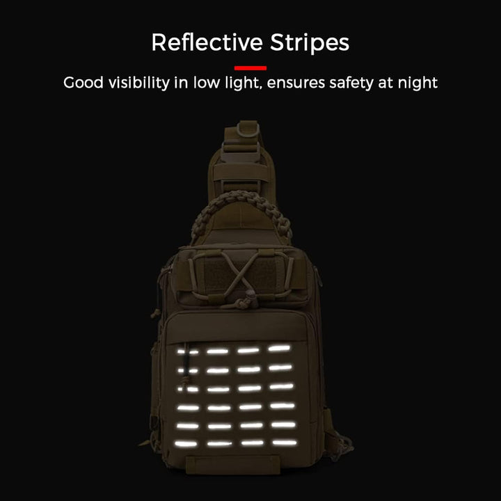 This fishing sling bag is made from durable ox cloth for water resistance and abrasion protection, keeping your gear safe in outdoor conditions. Multiple pockets provide organised storage for lures, lines, and tackle, while a bottom sleeve secures your fish lip gripper. The webbing loops allow you to hang small tools and accessories within easy reach. Reflective stripes improve visibility in low light, adding extra safety during night fishing or early morning trips. Compact yet spacious, it’s ideal for fishing, hiking, or camping.