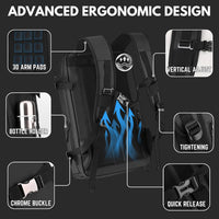 • Features: USB-C & USB-A ports, breathable straps, compression buckles, water-resistant zippers