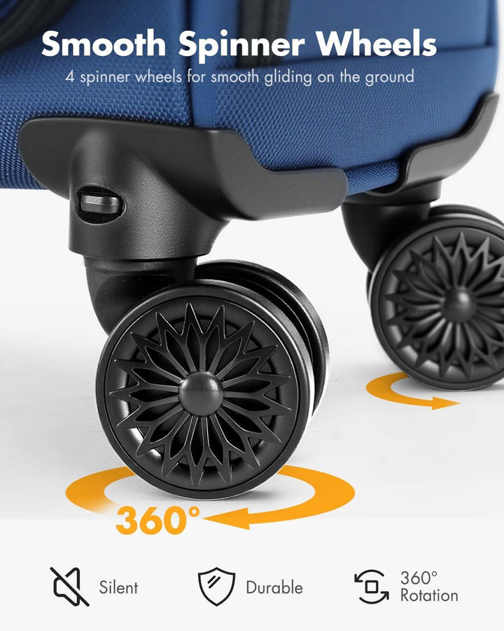 This 16-inch (40.64 cm) underseat carry-on is made from lightweight yet durable 1680D nylon for scratch resistance and long-term use. Its 8-pocket design includes a removable laptop pocket, quick-access compartments, and side pockets to keep everything organised. The detachable 360° spinner wheels ensure smooth rolling in any direction, while the telescopic handle offers easy manoeuvrability. Perfect for weekend getaways, business travel, or short flights, it keeps all your necessities close at hand.