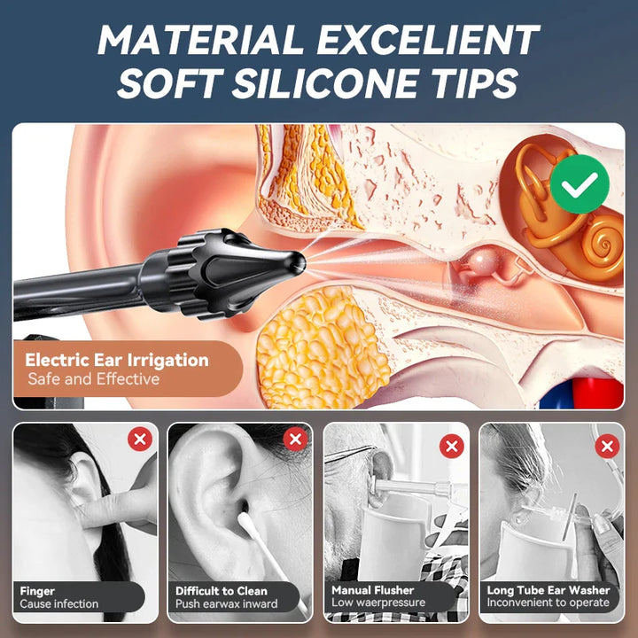 - Safe and Effective: The specially designed tip prevents going too deep into the ear canal, protecting sensitive ears. The five-hole ear tips provide a gentler rinse while ensuring thorough cleaning.